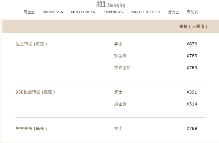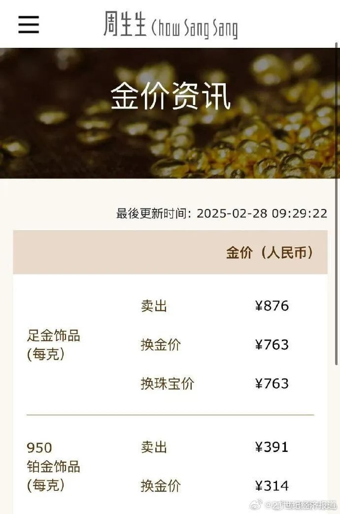 28日,周生生官网显示,足金饰品标价876元/克,25日标价为894元,3天跌18元,较20日高峰895元跌了19元。